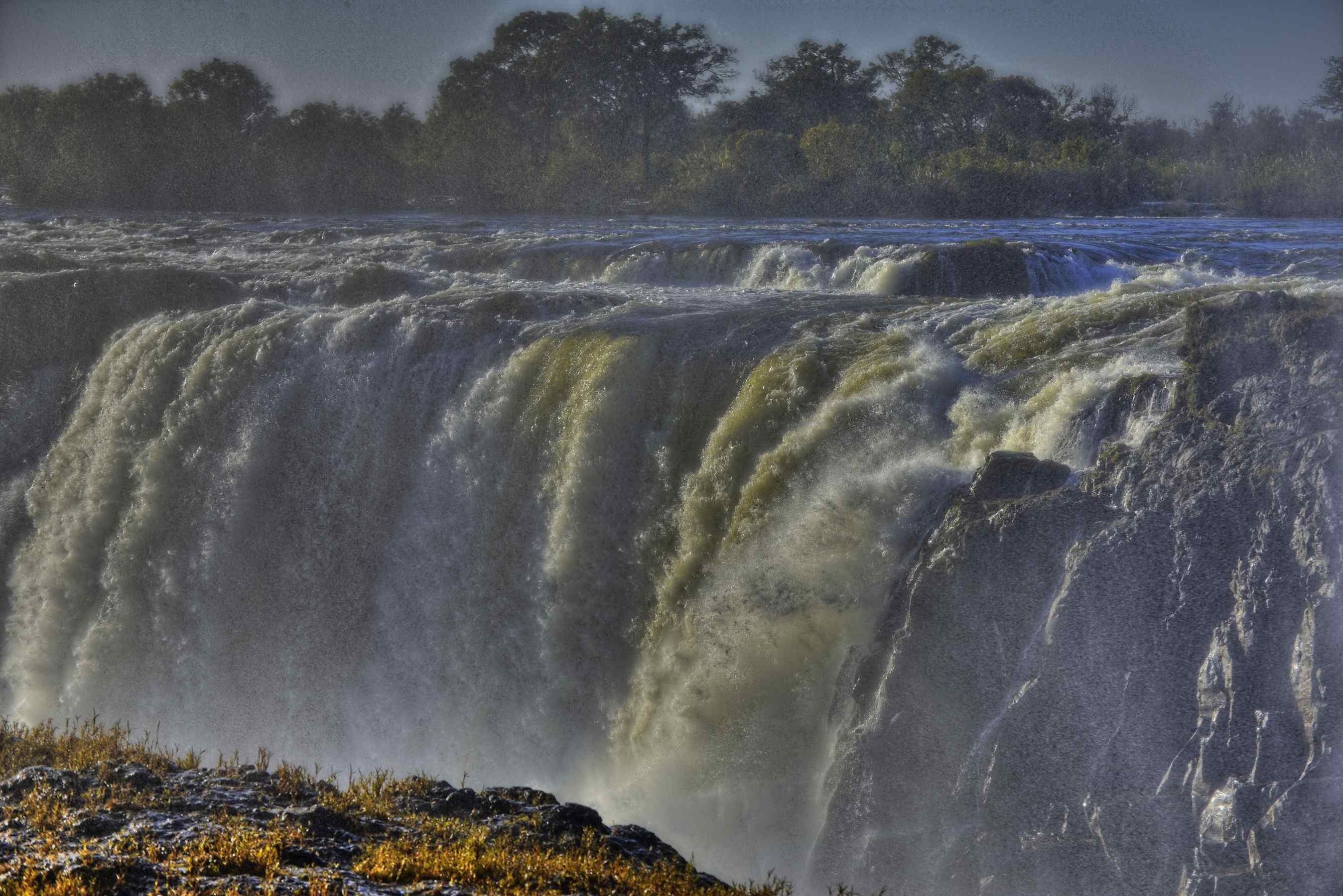 Ein besonderes Naturspektakel bieten die Viktoriafälle, Auf einer Breite von 1700 m fällt der grosse Zambezi-Strom mehr als 110 m in die Tiefe einer Basaltschlucht.